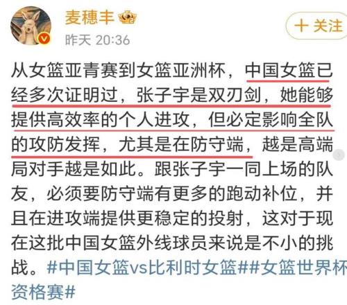 媒體人和球迷在點贊張子宇的同時,也大批中國女籃的打法,大批宮魯鳴的戰術,甚至張子宇也遭到吐槽。有球迷說,這樣的打法,即使張子宇轟30分也沒用。媒體人麥穗豐吐槽張子宇是雙刃劍,他說,“從女籃亞青賽到女籃亞洲杯,中國女籃已經多次證明過,張子宇是雙刃劍,她能夠提供高效率的個人進攻,但必定影響全隊的攻防發揮,尤其是在防守端,越是高端局對手越是如此。跟張子宇一同上場的隊友,必須要防守端有更多的跑動補位,并且在進攻端提供更穩定的投射,這對于現在這批中國女籃外線球員來說是不小的挑戰。”