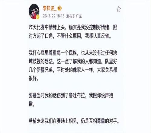 當然,任何地域性的攻擊都不值得被提倡,但要對李祥波上綱上線并不妥當,他當時也是因為在比賽中和魯吐布拉之間對抗太激烈,上頭了所致。