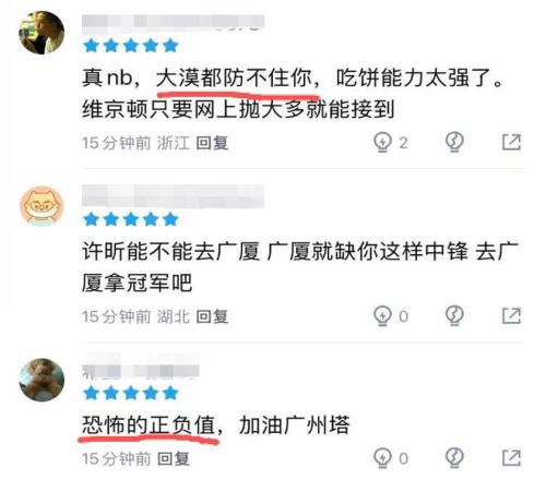 本輪廣州以16分優勢大勝遼寧的比賽,徐昕面對莫蘭德、付豪、張陳治鋒組成的內線群絲毫不落下風,全場出戰21分鐘,投籃10中9,罰球2中2,拿到20分9籃板(4前板),正負值+29。其中籃板、前場板、命中率、罰球命中率、正負值均是全隊第一。
