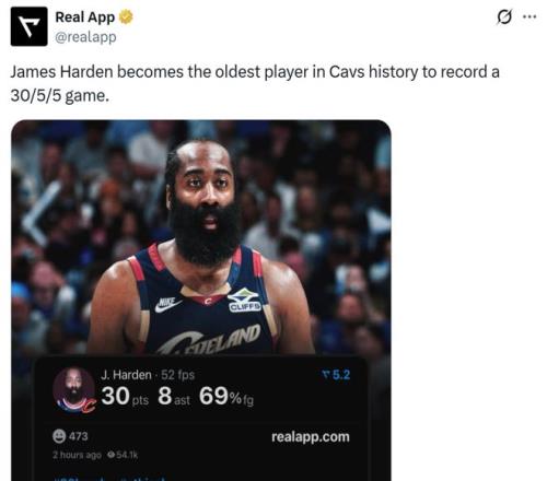 這讓36歲198天的哈登成為騎士隊史拿下至少30+5+5最老的球員。