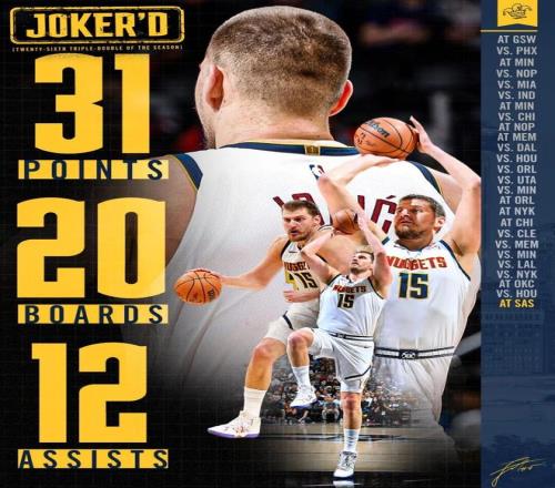本場比賽,約基奇再次貢獻了大號三雙:全場出戰39分鐘,投籃17中9,三分6中2,罰球11中11,得到31分20籃板12助攻3搶斷2蓋帽,正負值+8。