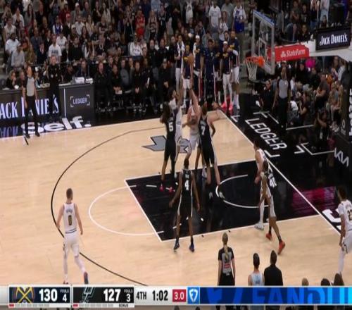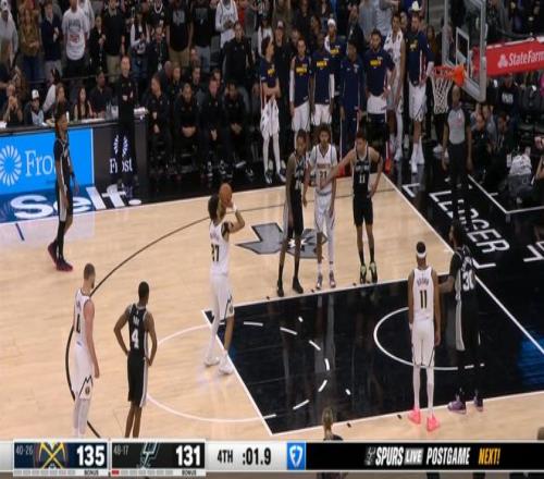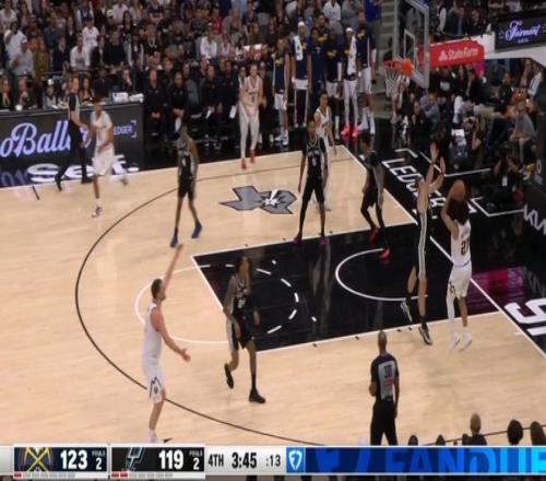 而這,甚至還不是結束,剩下1分鐘前,掘金130-127領先馬刺3分,然后穆雷與約基奇擋拆,面對幾乎三人防守下的轉身拋投再打進。