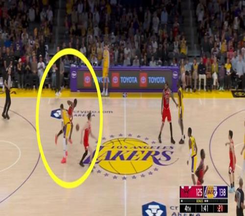 ——剩下4分56秒前,搶斷快攻上籃得到第43分