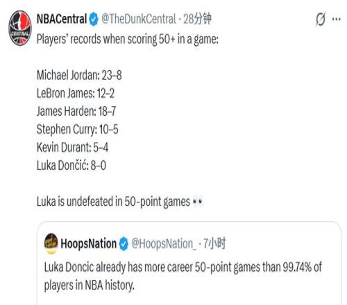 顯然,單論勝率,東契奇目前還是不敗的存在,詹姆斯的14戰12勝,在榜單上也算是勝率很高的了。在列出的這些球星中,杜蘭特的勝率較低,9場50+,其中4場球隊沒有贏球。