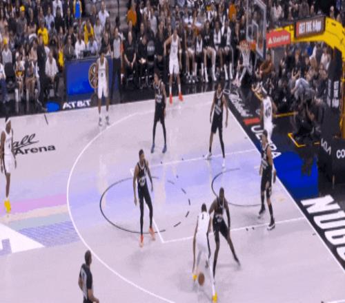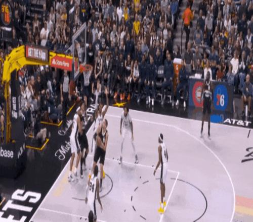 開場約基奇曾靠肩臂推開過文班背吃得手。下半場他不去禁區背吃了,但肩臂還能用嘛——弧頂接球,順勢左手推開文班,拋射:文班出禁區,馬刺禁區沒人了。