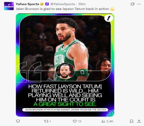 這場比賽之前,塔圖姆談到重返麥迪遜廣場花園球館,他在332天前在這片場地上遭遇了跟腱撕裂的大傷,他表示得知傷情的那一刻感覺自己籃球生涯都要結束了,雖然現在重回球場了,但回到這片傷心地自己還沒走出來,這場比賽對于自己來說會非常難熬。