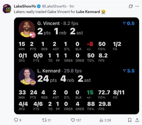 比賽還在進行中,湖人媒體曬出文森特老鷹首戰季后賽15分鐘2分2助攻,肯納德33分鐘已經拿到24分。