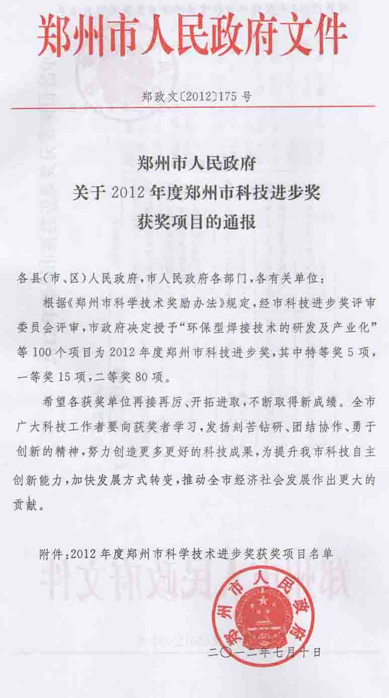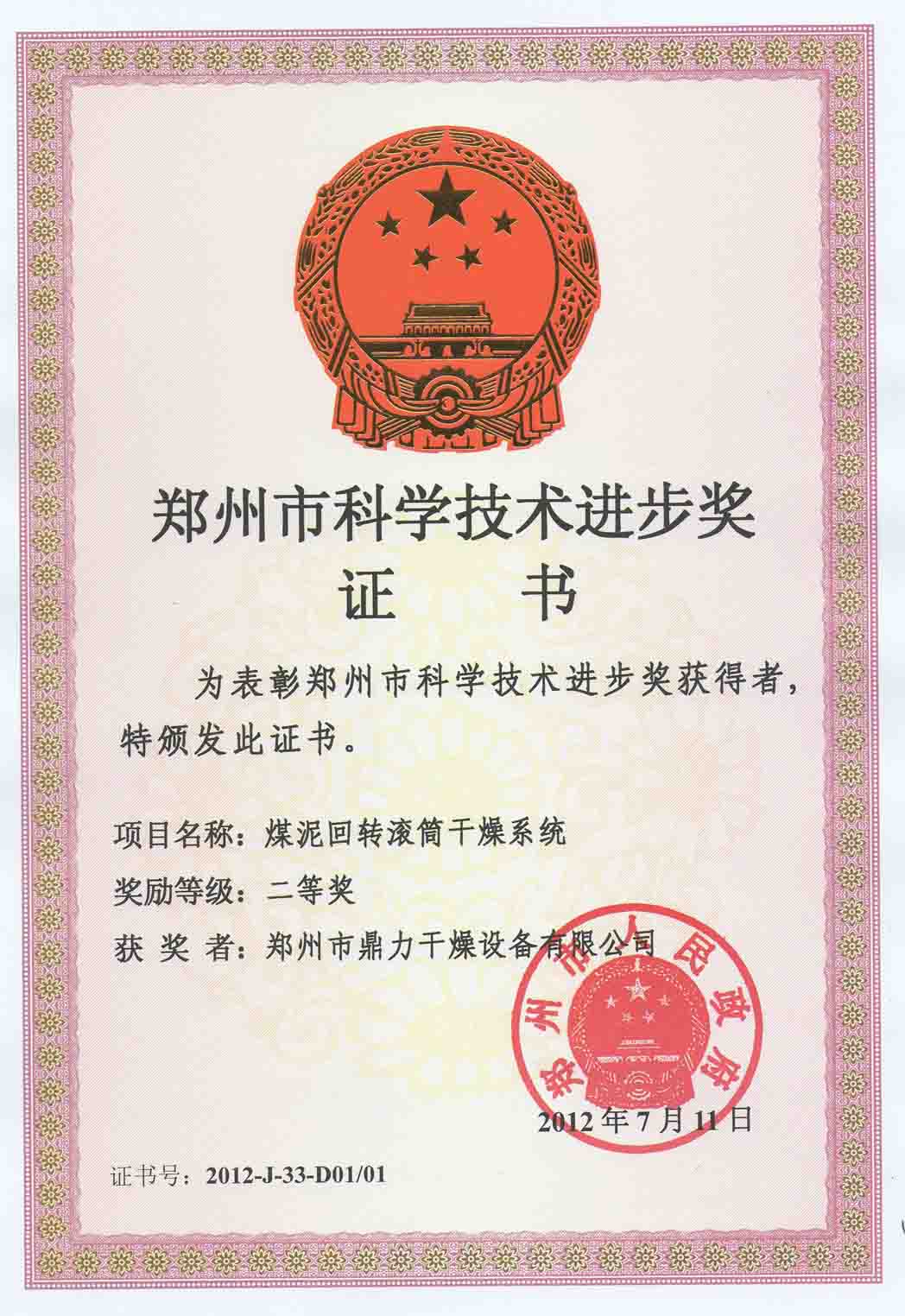 我公司煤泥回轉滾筒干燥系統項目被鄭州市科學技術局授予2012年度科技進步獎項二等獎獲獎榮譽證書。(圖)