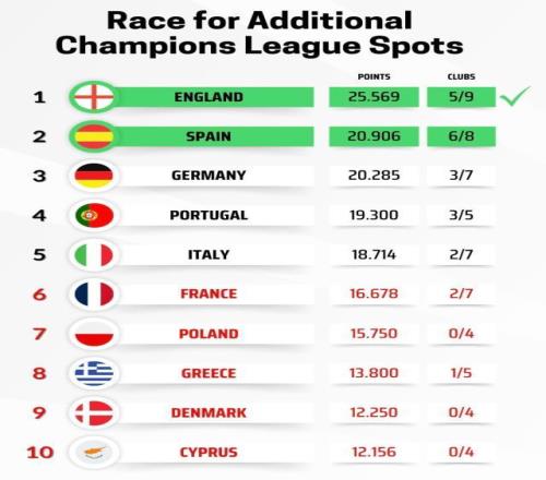 本賽季歐戰(zhàn)成績最好的兩個聯(lián)賽將各獲得一個下賽季的歐冠名額,英超在本周阿森納擊敗里斯本競技后,已提前鎖定一個,剩下一個主要由西甲和德甲競爭。目前西甲仍以一定優(yōu)勢領(lǐng)先德甲,且暫時有6隊存活,不過本輪過后皇馬、巴薩和塞爾塔都有較大可能出局。而德甲在三級歐戰(zhàn)各剩1隊,拜仁、弗賴堡和美因茨晉級前景樂觀。