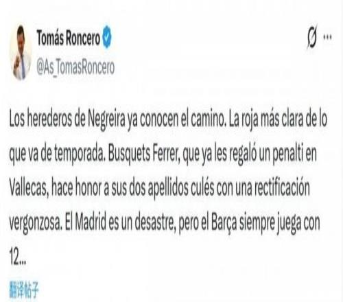 而皇馬名記龍賽羅自然也發(fā)文炮轟:“這是本賽季至今最明顯的紅牌。一次可恥的改判,皇馬表現(xiàn)確實(shí)糟糕,但巴薩永遠(yuǎn)是12人作戰(zhàn)?!?/p>