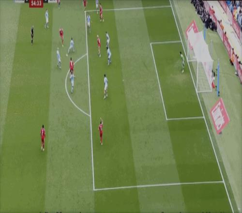 第57分鐘,奧賴?yán)智蛑罄^續(xù)前插,多庫直塞,奧賴?yán)麉^(qū)左側(cè)倒三角傳球,哈蘭德左腳推射空門得手,上演帽子戲法,4-0!