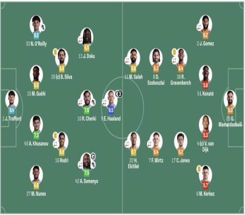 曼城(433):1-特拉福德;27-努內(nèi)斯,45-胡桑諾夫,15-格伊,33-奧賴?yán)?6-羅德里(62’14-尼科-岡薩雷斯),20-B席;42-塞梅尼奧(71’47-福登),10-謝爾基(71’4-賴因德斯),11-多庫(62’26-薩維尼奧);9-哈蘭德(77’7-馬爾穆什)